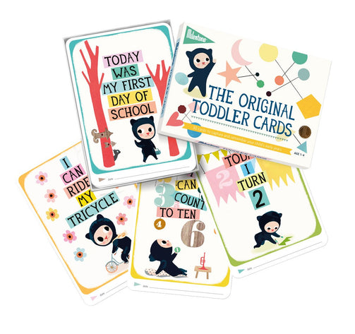 Photo Cards for Toddlers. This set of Toddler (Junior) Cards contains 30 cards with memorable events that occur somewhere around the ages of 1 to 4: learning to jump, dance, throw and catch a ball, ride a bike, count to ten, climb the stairs, are just a few of many toddler highlights. Remember your Toddlers moments with Milestone Cards for Toddlers. The perfect keepsake item.